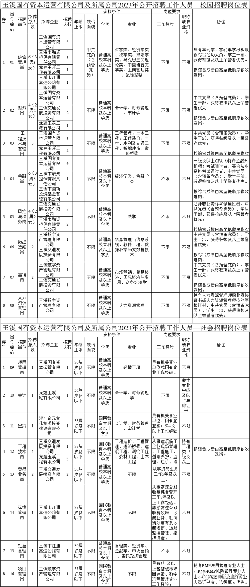 附件1:玉溪国有资本运营有限公司及所属公司2023年公开招聘工作人员—校园招聘岗位表