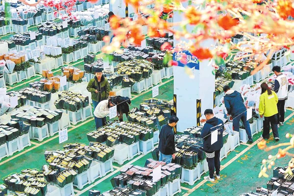 图为晋宁区国际花卉综合物流中心里,质检员对鲜花进行质检和定级。