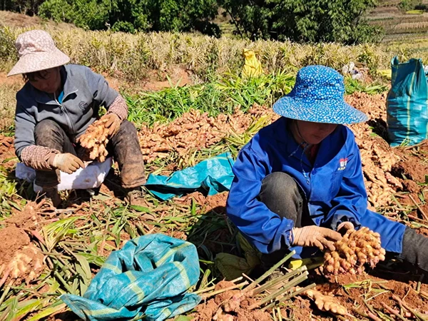 冬日暖阳下,普洱市景谷傣族彝族自治县碧安乡云中村村民罗成忠家的生姜地里,10多名工人正有序采挖生姜,田间地头姜香弥漫。