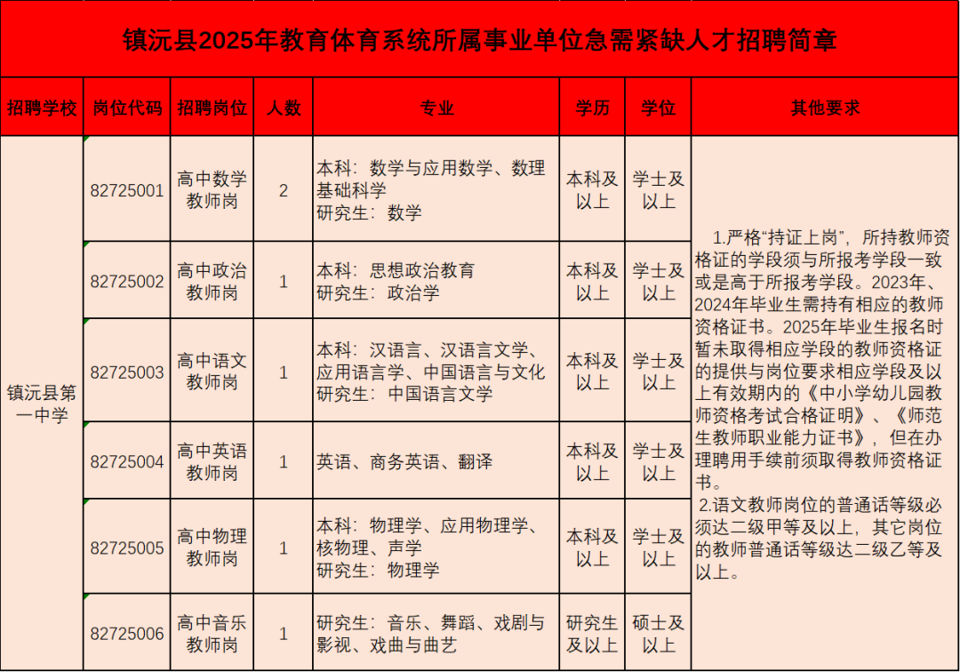 镇沅县第一中学:高中数学教师岗2名、高中政治教师岗1名、高中语文教师岗1名、高中英语教师岗1名、高中物理教师岗1名、高中音乐教师岗1名。