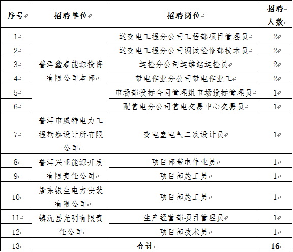普洱鑫泰能源投资有限公司(以下简称“普洱鑫泰公司”)为满足普洱鑫泰公司本部及所属各子公司用人需求,决定面向社会公开招聘16名工作人员,我司受普洱鑫泰公司委托开展本次招聘服务,现将招聘事项公告如下: