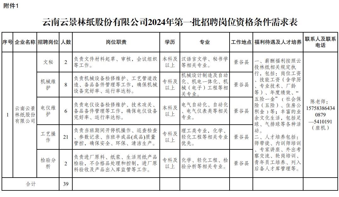 附件:1.云南云景林纸股份有限公司2024年第一批招聘岗位资格条件需求表