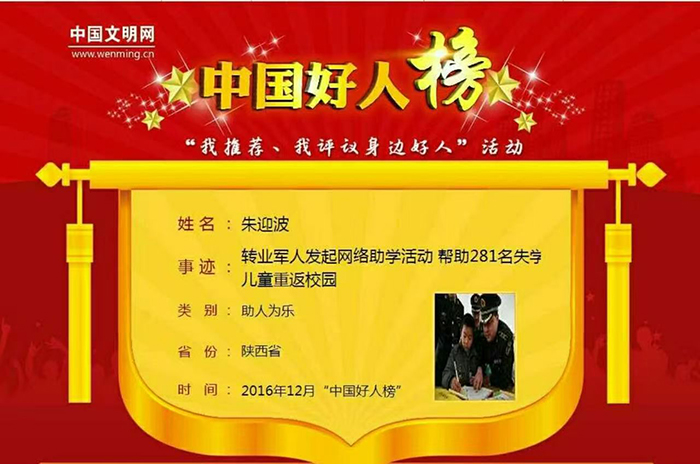 受三军仪仗队退伍父亲的言传身教,1992 年 12 月,朱迎波从陕西富平入伍,赴云南驻守的中国人民解放军第二炮兵某部服役。部队的思想教育与模范事迹浸润,让他悄然种下公益的种子,主动参与 “希望工程” 捐资助学。