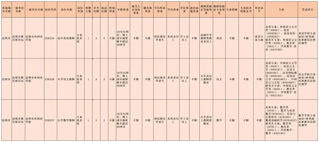 昆明市外国语学校2025年公开招聘计划招聘3人,所有符合岗位条件的人员均可报考。